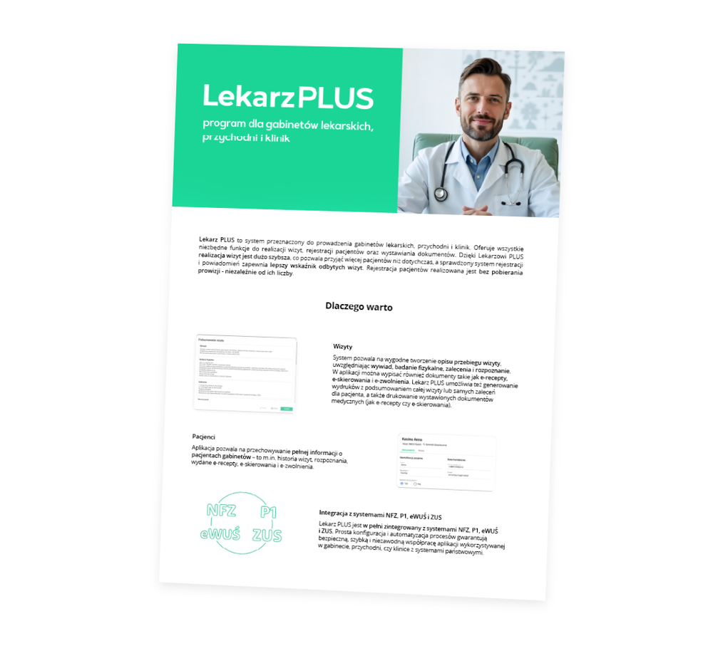 Lekarz PLUS to system przeznaczony do prowadzenia gabinetów lekarskich, przychodni i klinik. Oferuje wszystkie niezbędne funkcje do realizacji wizyt, wystawiania dokumentów i rejestracji pacjentów. Dzięki Lekarzowi PLUS realizacja wizyt jest dużo szybsza, co pozwala przyjąć więcej pacjentów niż dotychczas, a sprawdzony system powiadomień zapewnia lepszy wskaźnik odbytych wizyt.