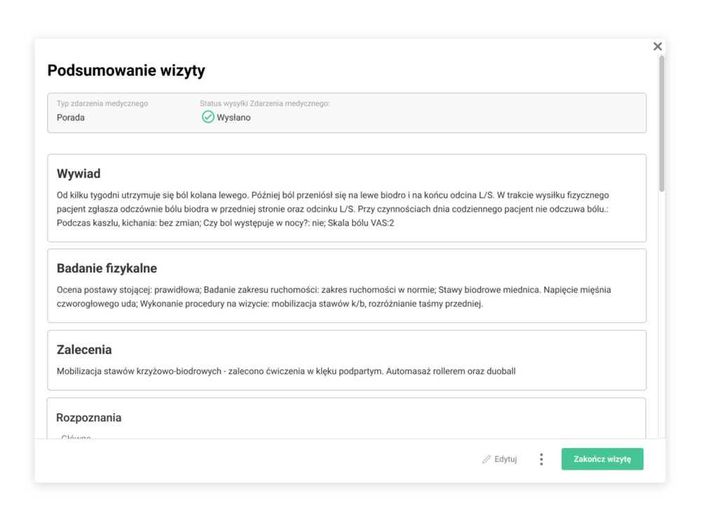 Lekarz PLUS to program dla fizjoterapeutów, który ułatwia tworzenie szczegółowych opisów przebiegu wizyty. Aplikacja pozwala na generowanie przejrzystych wydruków z pełnym podsumowaniem wizyty lub z samymi zaleceniami dla pacjenta. Można uwzględnić w nich wywiad, badania fizykalne, zalecenia i rozpoznanie, z wykorzystaniem międzynarodowej klasyfikacji ICF . Dzięki aplikacji Lekarz PLUS dokumentowanie wizyt staje się szybkie i intuicyjne, co pozwala w pełni skupić się na pacjentach.